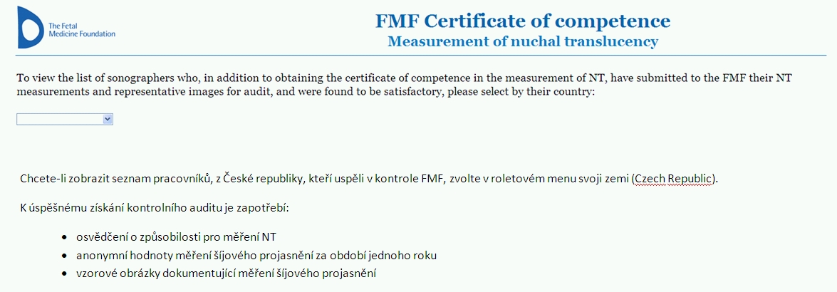 K provádění screeningu v I. trimestru je potřeba specielního zaškolení, znalostí v ultrazvkové diagnostice a v neposlední řadě zapojení do poměrně přísného systému kontroly. Není to samoúčelné, protože stanovení rizika je potřeba provést s maximální odpovědností a přesností. Neustále aktualizovaný seznam sonografistů, kteří jsou dostatečně erudováni a pravidelně kontrolováni mezinárodní certifikační autoritou- Nadací fetální medicíny se sídlem v Londýně (www.fetalmedicine.com/foundation) je na webu této certifikační autority, klikni zde a v roletovém menu zvolte Czech Republic. Adresy pracoviště jednotlivých sonografistů potom již najdete na internetu - seznam, klikni zde